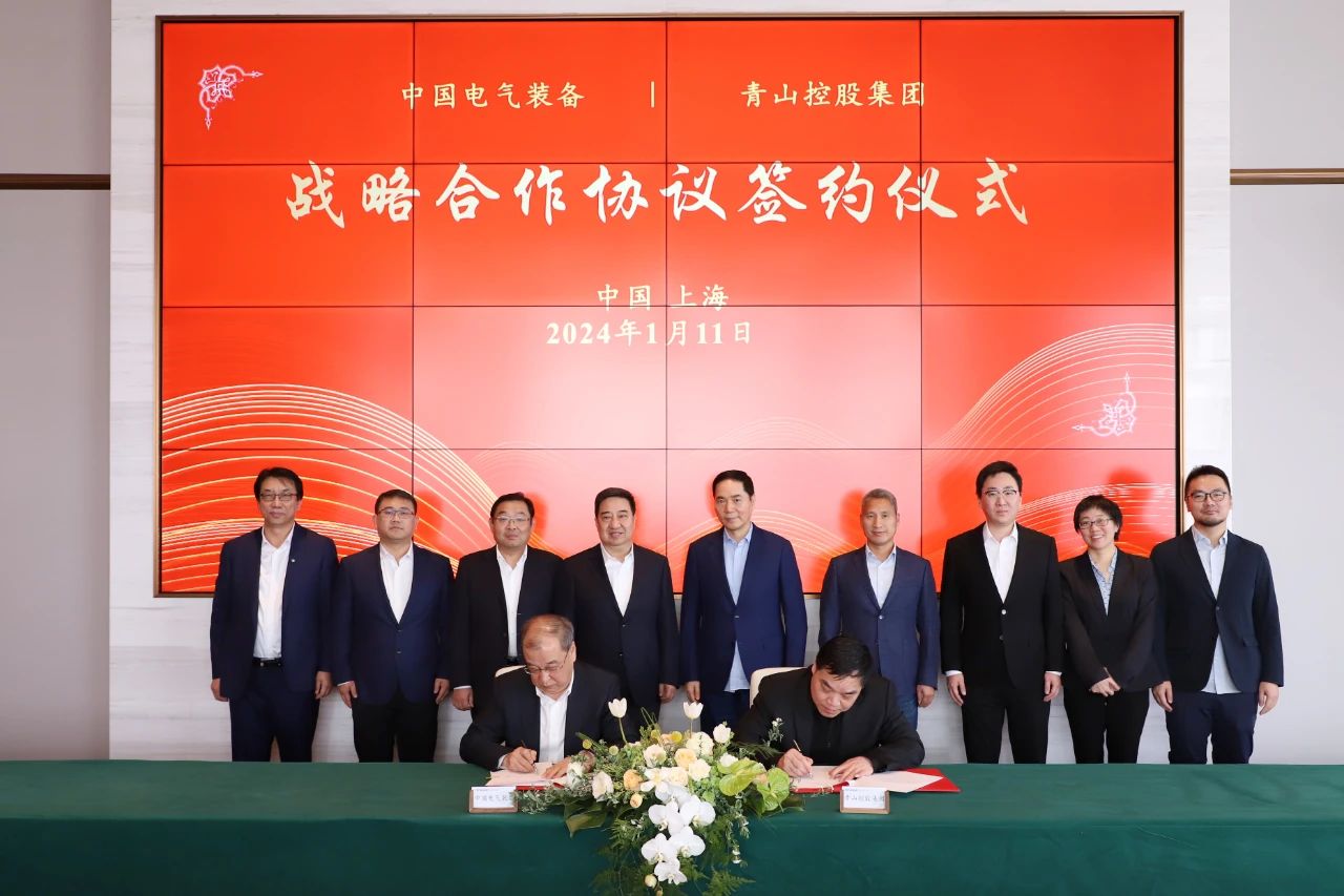 1月11日,中国电气装备与青山控股战略合作协议签约仪式在青山控股集团总部举行。集团公司党委书记、董事长白忠泉与青山实业董事局主席项光达会谈并共同见证签约。在与会领导的共同见证下,集团公司党委常委、副总经理成卫,青山控股集团党支部书记、永青集团副总裁孙元磷分别代表中国电气装备和青山控股签署战略合作协议。