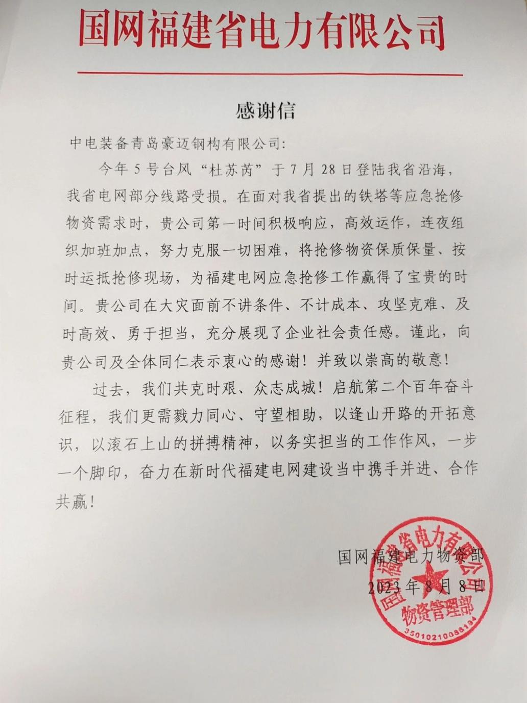 近日,山东电工电气所属青岛豪迈收到国网福建电力物资管理部感谢信,对企业在台风汛情面前,不讲条件、不计成本、攻坚克难、及时高效、勇于担当,高效优质完成供货表示衷心感谢。