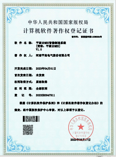 近日,由平高电气开发的KPI综合分析系统、平高云MES智能制造系统通过国家版权局审核,获得2项计算机软件著作权登记证书。