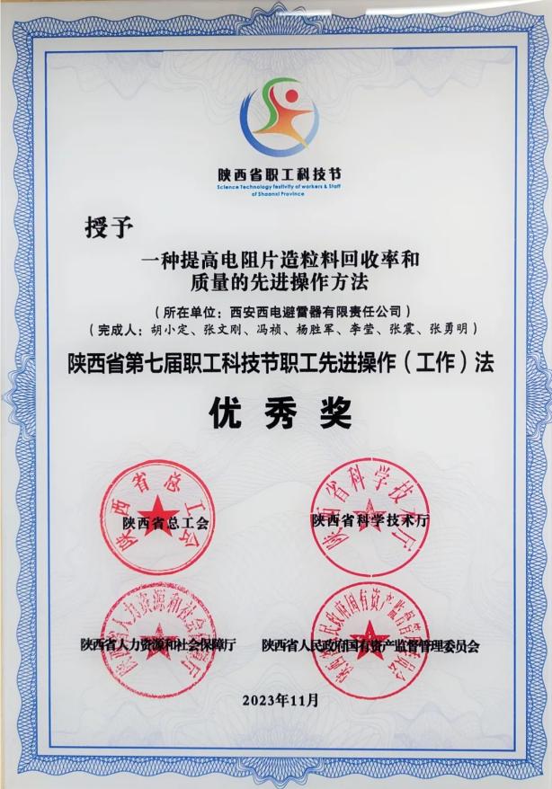 陕西省职工先进操作(工作)法优秀奖——中国西电所属西电避雷器“一种提高电阻片造粒料回收率和质量的先进操作方法”