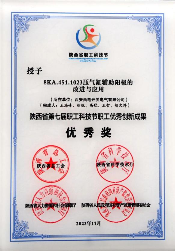 陕西省职工优秀创新成果优秀奖——中国西电所属西开电气“8KA.451.1023压气缸辅助阳极的改进与应用”