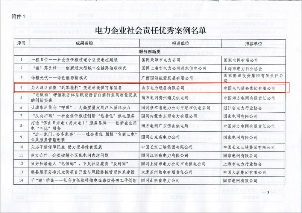近日,2023年度电力企业社会责任优秀案例名单发布,山东电工电气2个案例从300项案例中脱颖而出,获评2023年度电力企业社会责任优秀案例。