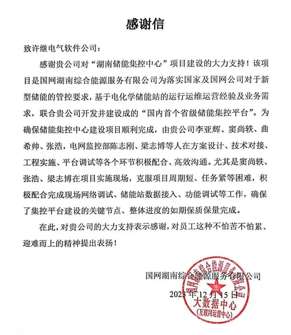 12月15日,国网湖南综合能源服务公司致信,对许继电气在湖南储能集控中心项目建设中给予的大力支持和优质服务表示感谢。
