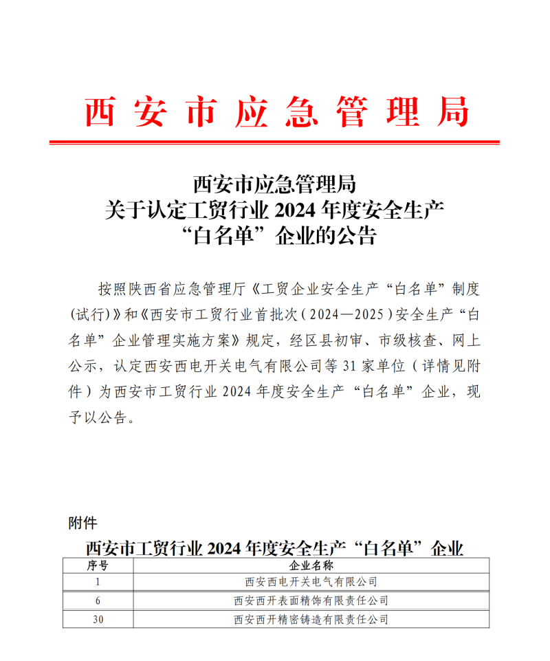 近日,西安市应急管理局公布了工贸行业2024年度安全生产“白名单”企业名单,中国西电所属西开电气、西开铸造、西开精饰凭借其在安全生产管理方面的卓越表现成功入选,为公司的安全生产工作树立了新的标杆。