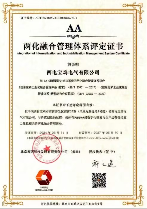 近日,西电宝鸡电气通过工业和信息化部《信息化和工业化融合管理体系要求》及《信息化和工业化融合管理体系新型能力分级要求》体系认证审核,取得两化融合管理体系“AA”级认证证书,标志着西电宝鸡电气在推进“信息化”和“工业化”深度融合方面获得国家最权威认可,彰显了企业在两化融合方面取得新的突破。