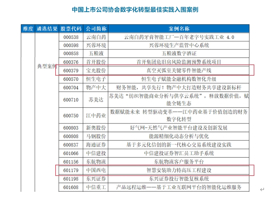 日前,中国西电申报的“智慧安装助力特高压工程建设”和中国西电集团所属宝光股份申报的“真空灭弧室关键零件智能产线”从300余份数字化转型案例中脱颖而出,成功入选中国上市公司协会组织的第三届中上协上市公司数字化转型情况调研及最佳实践征集活动场景创新典型案例。