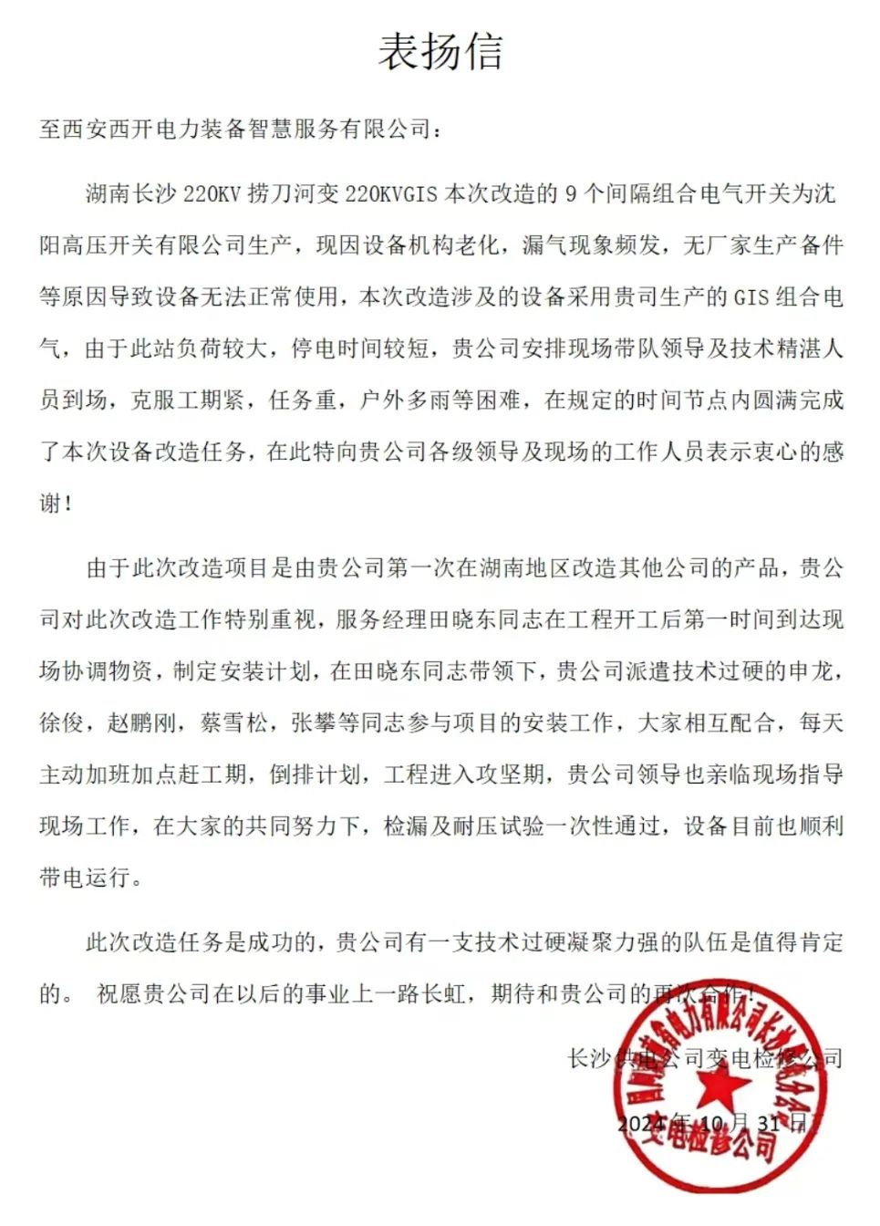 近日,中国西电所属西开电气承担的捞刀河220kV大修工程在国网湖南省电力有限公司与西开智慧服务的共同努力下,圆满竣工并顺利投运!这一项目的成功实施,展现了西开智慧服务在跨品牌技术改造方面的专业能力和技术水平,彰显了在电力检修领域的卓越实力,为湖南地区的电力供应增添了新的活力!