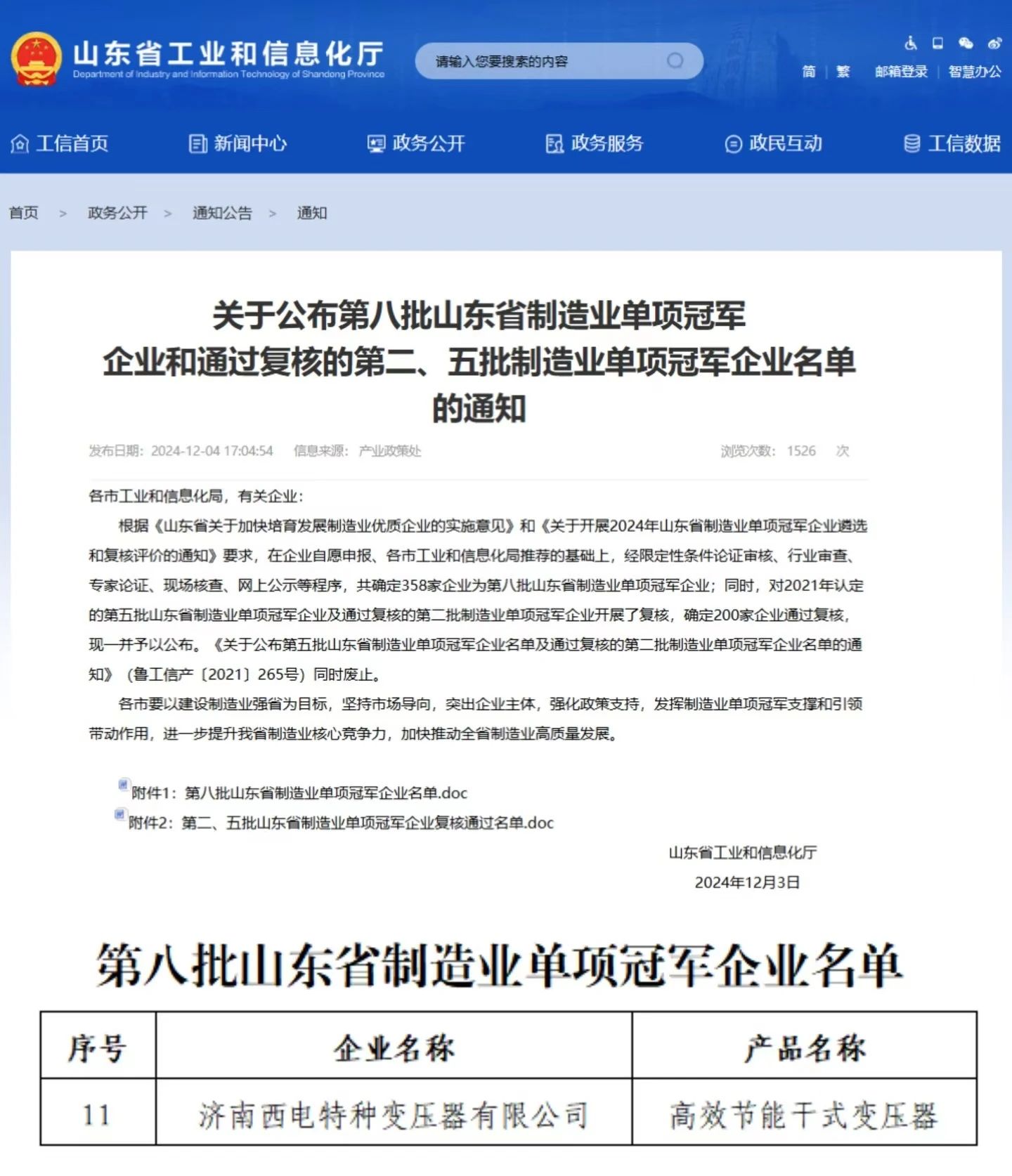 近日,中国西电所属济变济特主导产品高效节能干式变压器,凭借其卓越的节能性能、稳定的运行表现以及创新的技术工艺,在众多竞争者中脱颖而出,获评“山东省制造业单项冠军”。