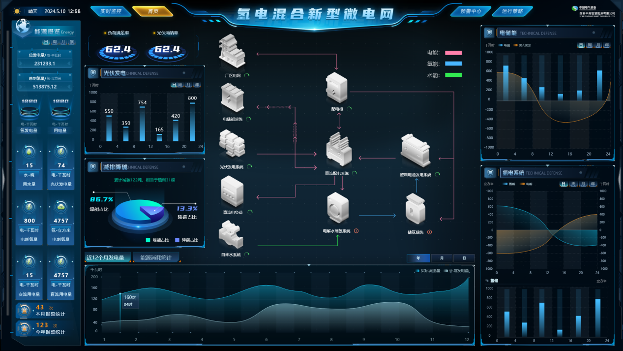 近日,平高集团所属西安平高独立研制的预装式氢电互动系统在平高集团智慧能源科技创新基地完成现场调试工作。该系统采用预装式、模块化设计,集成电源平台、电解水制氢、燃料电池、能量控制器等设备于一体,打造综合供能内循环体系,可以将源源不断的不稳定清洁能源进行制氢储能,并在用户需要时进行氢供应或氢发电,实现电、氢、热的稳定输出和就地利用,该示范项目是平高集团落实国家双碳战略,探索电氢多元耦合发展的积极实践。