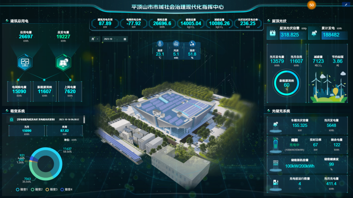 据了解,此次获奖项目以平顶山市市域社会治理现代化指挥中心为依托,通过建设绿色供电系统、光储充微网系统及智慧管控系统,开展智能配电运维,打造“绿色低碳、能源物联”的新型智慧化场馆建筑。项目已于2022年12月投运,累计产生绿电575471千瓦时,减少二氧化碳排放474.2吨,实现指挥中心“节能降碳、智能用电、智慧物联”,建造鹰城公共建筑节能降碳标杆示范工程。