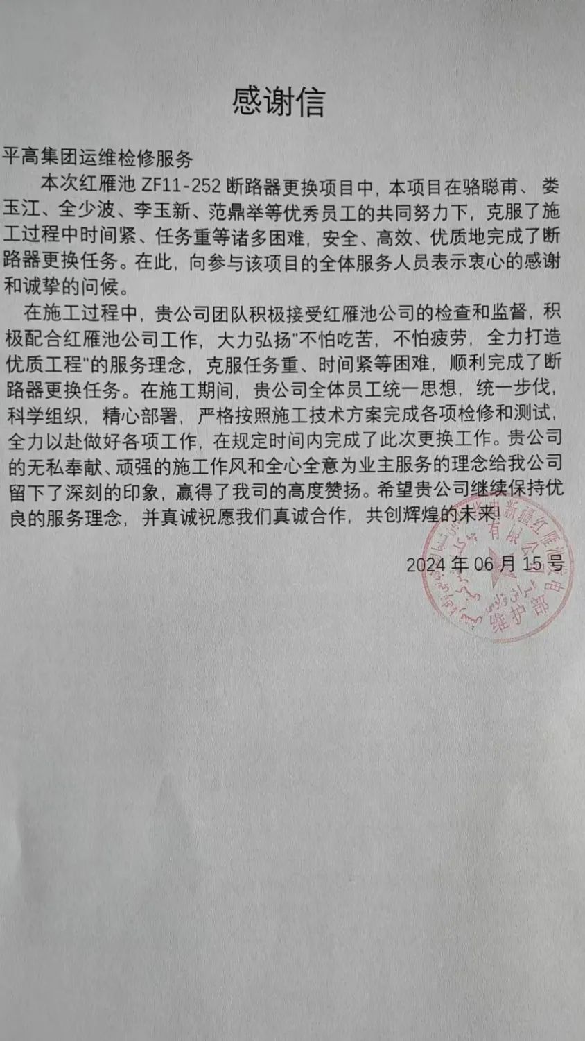 自春检开始以来,运检服务/电力检修不怕吃苦,保质保量,想客户之所想,急客户之所需,顺利完成了春检期间的各项检修项目,得到各个地区客户的认可,累计收到客户感谢信20封、锦旗3面。