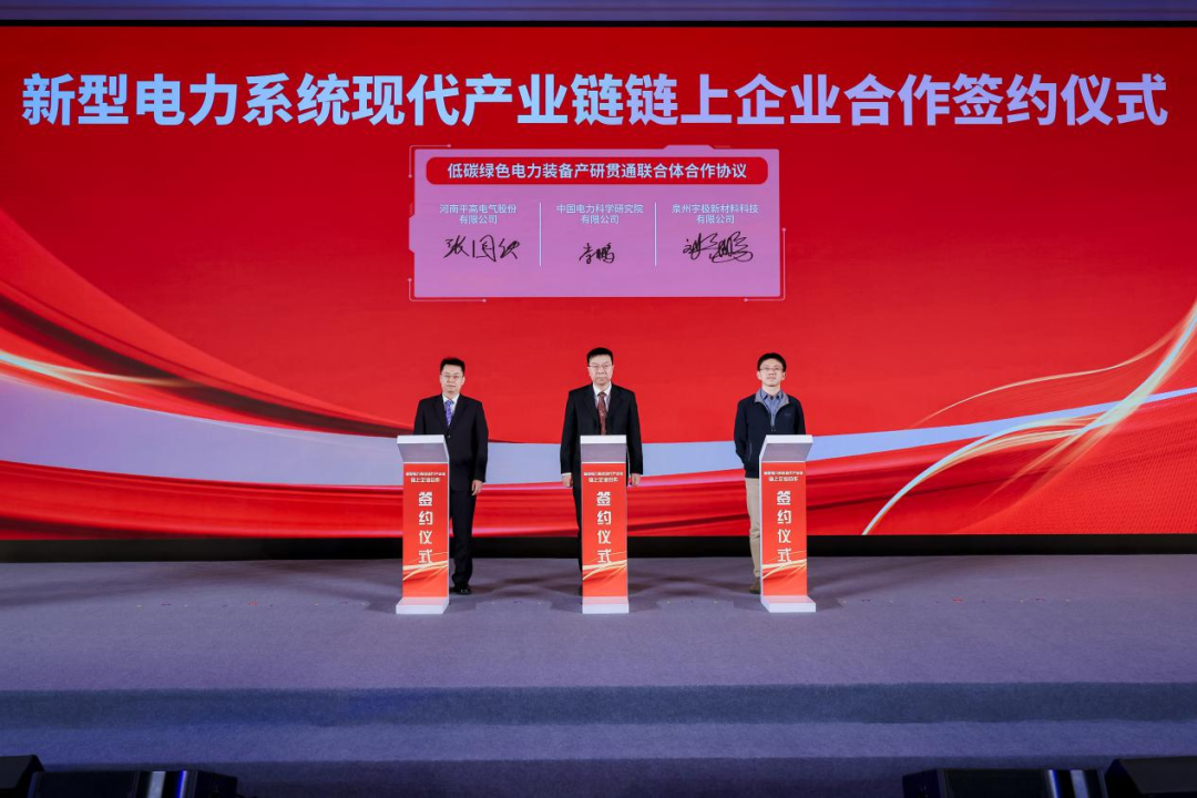 会上,平高电气与中国电科院签署低碳绿色电力装备产研贯通联合体合作协议,进一步加强双方在新型环保气体绝缘技术、开断技术等方面的务实合作,共同推进开关绿色新技术的应用,携手支撑新型电力系统建设。
