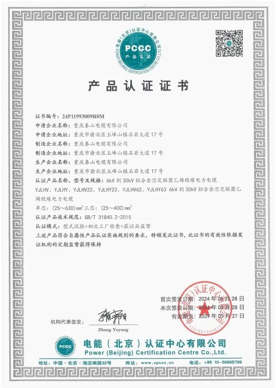 此次评审期间,审核专家主要检查了涉及中低压电力电缆(含铝合金电缆)、控制电缆产品认证的相关内容,具体包括质量管理、设备管理、采购控制、技术管理等九个方面。经过严格评审,最终一致评定同意泰山电缆获得PCCC证书。