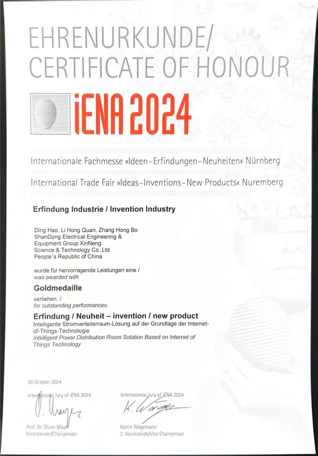 近日,山东电工电气所属新能科技《基于物联网技术的智慧配电房解决方案》在全球众多国家的创新发明产品中脱颖而出,夺得第76届德国纽伦堡国际发明展金奖。